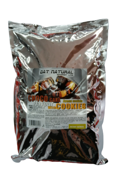 Oatmeal. Net weight: 1 kg. Mode of preparation: Mix with protein in a shake for breakfast, mix with egg white to make pancakes or add to any homemade recipe. Ingredients: Oatmeal (gluten), cocoa powder (soy), chocolate cake with biscuit flavour (gluten, milk) and sweetener (sucralose).